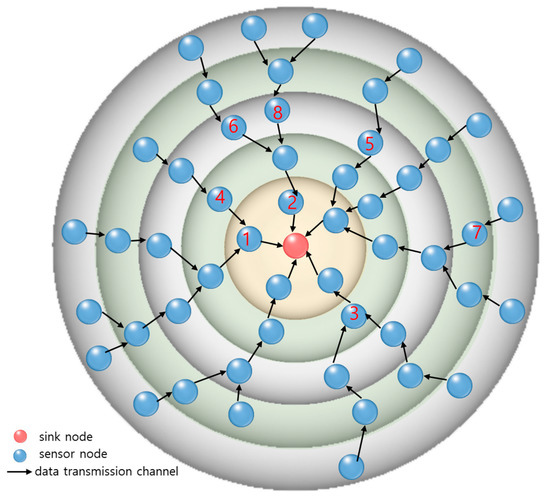In the proposed method, the buffer threshold may be different depending on the group. The buffer threshold of smart sensor nodes that belong to a group far from the sink node (larger group ID value) is smaller than that of adjacent smart sensor nodes (smaller group ID value). In other words, the buffer threshold of smart sensor nodes in each group is in inverse proportion to the distance from the sink node. A smart sensor node saves its own data and data from other nodes in its buffer. When the data volume in the buffer is the same with or exceeds the buffer threshold, the data are transmitted to the most adjacent smart sensor node of the next higher-level group. Smart sensor nodes far from the sink node have more opportunities to send data to neighboring nodes than those near the sink node. In this manner, the proposed method maximizes the entire system’s energy efficiency.