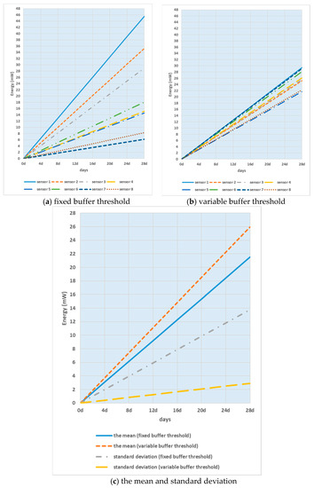 When every smart sensor node uses the fixed buffer threshold regardless of the group ID and when variable buffer thresholds are used depending on the group ID, the energy consumption of smart sensor nodes over time may be different as shown in Figure 9. The variable buffer threshold was calculated by applying Formula (6), and it was assumed that data were transmitted from each smart sensor node to the sink node at intervals of 15 min.