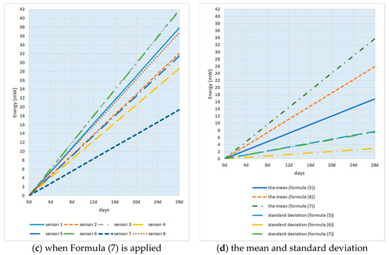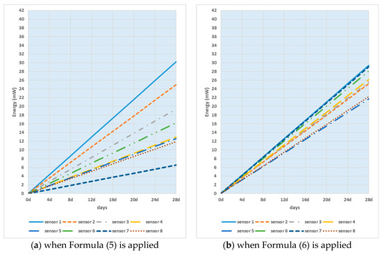 Figure 10 shows smart sensor node energy consumption when the variable buffer threshold was applied depending on each group ID. Formulas (5)–(7) were used.