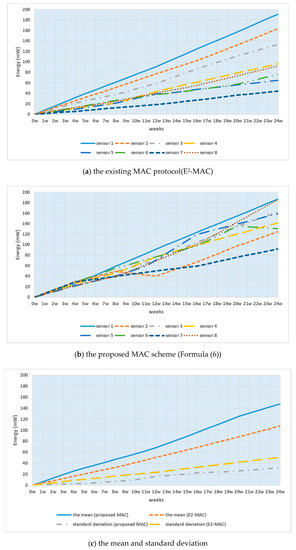Figure 11a shows the smart sensor node energy consumption of the existing MAC protocol to which fixed buffer thresholds are applied. Figure 11b shows the smart sensor node energy consumption of the proposed method that applies variable buffer thresholds. In Figure 11c, the mean of energy consumption was low among smart sensor nodes of the existing MAC protocol. But, standard deviation of energy consumption was high among smart sensor nodes. On the other hand, the mean of energy consumption was high among smart sensor nodes of the proposed MAC scheme. Standard deviation of energy consumption was low among smart sensor nodes. The simulation result indicates that the energy consumption among smart sensor nodes of the proposed method is uniform in comparison with that of the existing MAC protocol.