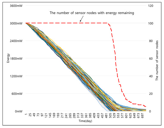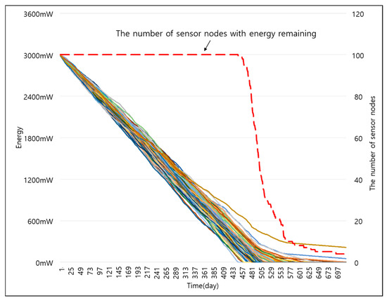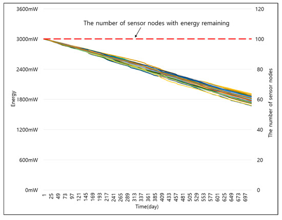 Figure 14 and Figure 15 show the energy consumption of smart sensor nodes over time when the size of data was 100 and 200 B respectively. The energy consumption of smart sensor nodes decreased over time at a similar rate, and most smart sensor nodes ran out of energy at a similar timing.