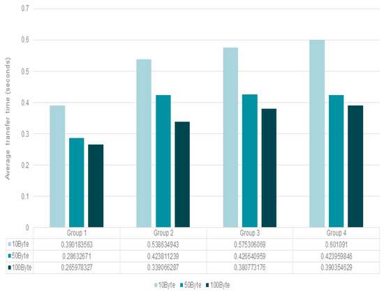 Figure 16 shows the average duration of ordinary data transmission by smart sensor nodes of each group depending on the data size. As the Group ID value was small, the duration of ordinary data transmission by smart sensor nodes was relatively short. As the size of data was large, the average data transmission time was short. Since different variable buffer thresholds are set for each smart sensor node group, the time to reach the buffer threshold is shortened as the data size is large and the group ID value is large.