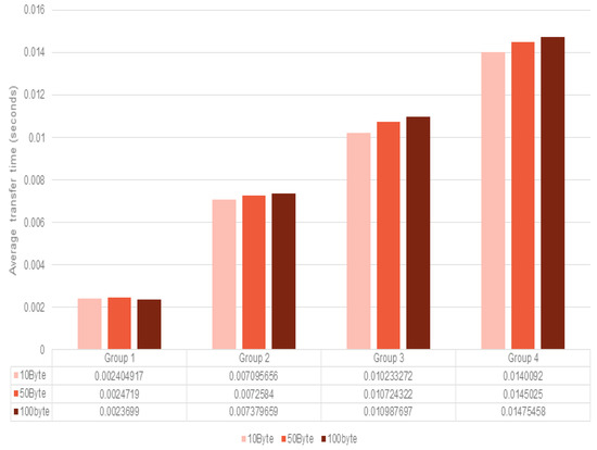 In order to verify that smart sensor nodes could handle urgent data with no transmission delay in the proposed method, the average duration of data transmission from the smart sensor nodes of each group to the sink node was compared. With data of various sizes classified to ordinary and urgent data sets, the average duration of data transmission from smart sensor nodes (Groups 1–4) to the sink node was measured.