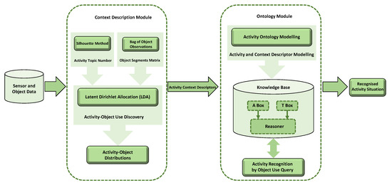 The framework consists of two component modules: the context description module and the ontology module. Object use for specific routine activities as activity-object use distributions and activity context descriptors are discovered using a LDA topic model in the context description module. An activity ontology is developed using the discovered object use for the respective activities as ontology concepts in the ontology module. Activity recognition is achieved by observed object use query on the activity ontology for the relevant activity situations. As a unified framework, the functions of these component modules are integrated to provide a seamless activity recognition platform which takes in inputs of sensor and object use observations captured in the home environment representing atomic events of object interactions. We describe in detail the component modules in the following subsections.