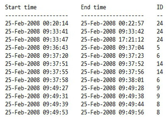 A part of the Kasteren House A dataset with Objects/Sensors ID represented as: 24 = Hall-Bedroom Door; 5 = Hall-Toilet Door; 6 = Hall-Bathroom Door; 14 = ToiletFlush; 9 = Plates Cupboard; and 8 = Fridge.