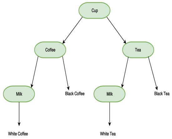 Scenario 2: Suppose a kitchen environment has the objects Cup, Coffee, Milk and Tea. White Coffee, Black Coffee, Black Tea and White Tea are four likely activity situations that could result from the combinations of these object based on preference. Basically, the tree illustrated in Figure 4 shows the four activity situations. The property relationship hasLastObject can be used to specify precedence which then results to granular activities of choice. Possible orders of object use with Cup as first object use leading to White Coffee, Black Coffee, White Tea and Black Tea can then be encoded as Equations (13)–(16), respectively.