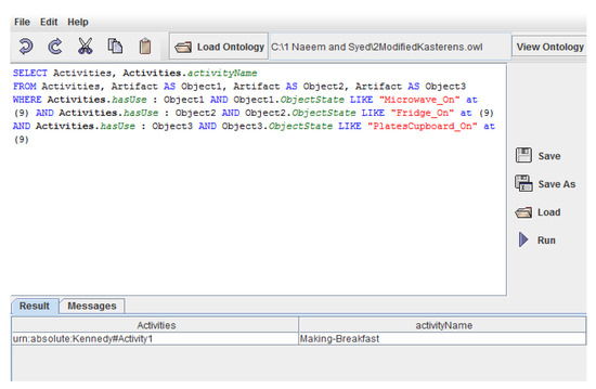 The activity concepts were also modelled accordingly, but due consideration was given to Make Food which represented a group of activities. The Make Food activity, as it implies, corresponds to a group of activities involving making of food and ranges from Breakfast to Dinner. With regards to the Kasterens dataset, we class Breakfast, and Dinner as static activities with super class Make Food sharing same or similar context descriptors and also they are performed at specific times of the day. To further enhance shared ontology concepts and reuse, we harmonised the Kasteren and Ordonez activity concepts, as illustrated in Figure 6, onto the activity ontology to form a set of unified activity concepts. Similar to the object concepts, we have colour coded activity concepts in this unified set of activity concepts with static and dynamic activities as super classes so that the green rounded rectangle represents common activity concepts and blue rounded rectangle as activity concepts in the Ordonez house and not in the Kasteren House. As part of our proposed framework, we added instances and individuals to the object concepts making the model more expressive (assertions used in populating the ABox) for example instantiating Microwave with Microwave_On to suggest the state of the object or sensor when in use. The ABox was further populated with assertions using object and data properties as we explained in Section 3.2 incorporating the context descriptors for the activity situations preparatory for activity recognition. The modelled activity situations or concepts are then linked to their respective context descriptors as object states through the properties as assertions added to the ABox. Activity recognition is enabled by an object use query to retrieve activity situations based on observed sensor or object data. Algorithm 2 implements the recognition process. To facilitate execution of activity inference, the modelled activity ontology is imported into the TOQL environment [37], as illustrated in Figure 7. Object based queries are executed by mapping the observed objects and its temporal information from the dataset to the closest activity in the imported activity ontology through ontological reasoning.