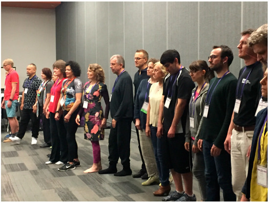 The workshop was divided into two main parts. The first part involved sensitizing and foregrounding somatic and experiential sensibility through a series of first person experiences. For example, to hone the participants’ abilities to be aware of and be empathetic towards oneself and others, we performed a Collaborative Walking exercise devised by one of the authors [25] (drawn from the Body Weather performance training methodology [48]). All workshop participants stood in a line, shoulder to shoulder, very close to one another, with a red thread joining the whole line, from the first participant to the last, through their mouths, see Figure 1. We were asked to close our eyes and then walk together, very slowly, without losing contact with our neighbours. After the exercise, we were asked to articulate our experience, sharing any insights or discoveries on walking. This transported us to the space of felt experiences—reminding us not only intellectually of why we were there, but somatically. It also provided a shared somatic experience of performing a simple movement exercise, but with heightened awareness. The exercise itself was selected for its close similarity to the everyday act of walking, but reframed in an unusual configuration for the purpose of defamiliarizing the habitual—a somatic principle we elaborate upon in Section 4.2.1.