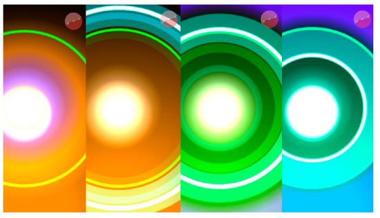 The first example is BrightHearts [62], an interactive artwork and biofeedback application for mobile phones and tablets, developed as a tool for reducing pain and anxiety experienced by children undergoing painful medical procedures. Decreases in heart rate are used to modulate the diameter and color of a collection of overlapping concentric circles, see Figure 2. The more relaxed you are, the less bright and warm colors appear at the interface. The application invites users to explore ways to decrease their average heart rate through a combination of muscle relaxation, slow breathing and relaxing memories—decreases are rewarded with gentle chimes, and new layers of colorful circular imagery. The project continues Khut’s on-going exploration of the somaesthetic potential of biofeedback as a way to facilitate deeply embodied experiences, self-efficacy, and reflections on the ways we experience and apply our attention to voluntarily influence our stress and relaxation responses. First-person experience is central to design of these displays—the movement and responsiveness of the various layers and sounds is literally coded onto and around the artist/designer’s own physiology, and adjusted to achieve a balance between responsiveness to changes in heart rate, and movement (animation) qualities appropriate for the application’s relaxation-training aims. These mappings are then tested with other users. Works such as this are designed to respond in an aesthetically compelling and rewarding way to voluntary adjustments to nervous system reflexes—the responsiveness of the sounds and visuals to the dynamics user’s nervous state—the sense of how these displays ‘fit’ in relation to these movements—can only be fully appreciated by the person interacting with the display, in much the same way as with clothing—where ‘fit’ is best judged by the person wearing the clothing item.
