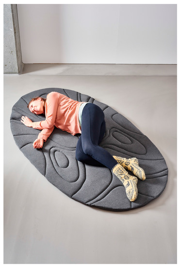 The Soma Mat uses directed heat stimuli to subtly guide your attention to different body parts [64,65,66], see Figure 3. The mat can be used as a support for exercises aimed at increased body awareness such as guided meditation, for body scanning, in Feldenkrais sessions, or simply for relaxation. Integrated into the mat are a number of heat pads that can provide spatially directed heat pulses, and a pair of speakers. An application on a mobile phone is used in conjunction with the mat, with a number of pre-recorded audio sessions aimed at increasing body awareness. The instructions engage participants in very slow movements, while simultaneously directing attention to the different parts of our bodies and how they interact.