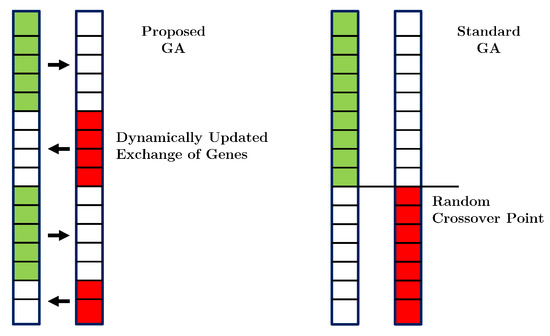 The GA then starts a crossover in which small subsets of trips (“genes”) from parents A and B are exchanged between them in a random manner. The number of exchanged trips is dynamically updated based on the influence of the exchange to the minimization of the penalty function score. The fitness value of the generated offspring is evaluated after the exchange and if there is no improvement, the recombination of the parents continuous with a different number of exchanged genes until an improvement is observed. This approach differs from the typical crossover phase of a GA where the genes of the two parents are exchanged at a random crossover point as it is presented in Figure 1 (Shrestha and Mahmood [35]).