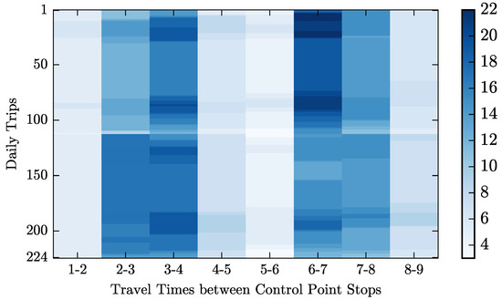 For computing the optimal dispatching times, the travel times of bus trips between the control points are estimated with the use of Automated Vehicle Location (AVL) data gathered over a 4-month period. Travel times in transport networks can vary significantly over different time periods of the day due to road traffic and passenger demand fluctuations (Dorbritz et al. [37]). This is evident in our analysis of historical AVL data, the results of which are presented in Figure 2. Figure 2 presents the estimated travel times between control stops for all daily trips. In direction 1, the travel times between control point stops 6 and 7 have the highest values of 19–22 min which peak between trips 3 to 25 and trips 76 to 85. A similar pattern can be observed between control point stops 3 and 4 from the 118th trip to the 126th and from the 180th to the 200th. The lowest travel time is observed between control point stops 1 and 2 and control point stops 5 and 6 as well as control point stops 8 and 9 on both directions.