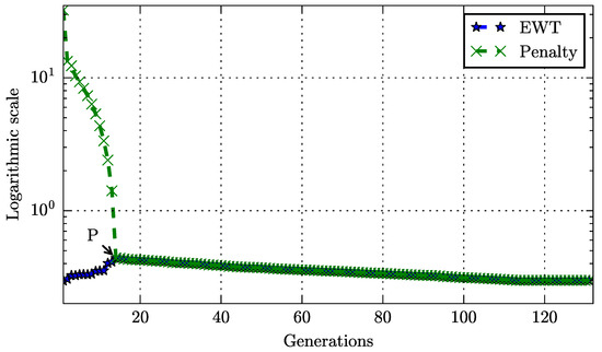 From Figure 3, it is evident that all constraints are satisfied after 14 generations and at that point the penalty function value is equal to the EWT of passengers at the control point stops (as it is noted by the point P that has a value of 0.44 min). From the beginning of the optimization process until the 14th generation, the EWT of passengers was increased because the GA prioritized the satisfaction of regulatory constraints. After the 14th generation, all regulatory constraints are satisfied and every new generation improves the penalty function score and the EWT of passengers simultaneously because the two functions have become identical. The evolution continuous until the 113th generation because after that generation there are no further improvements at the penalty function score. At that generation, the service-wide excess waiting time of passengers is 0.298 min and the computed timetable satisfies all regulatory constraints. It should be noted here that if the travel times between control point stops were stable throughout the day, the EWT of passengers could have been even closer to zero.