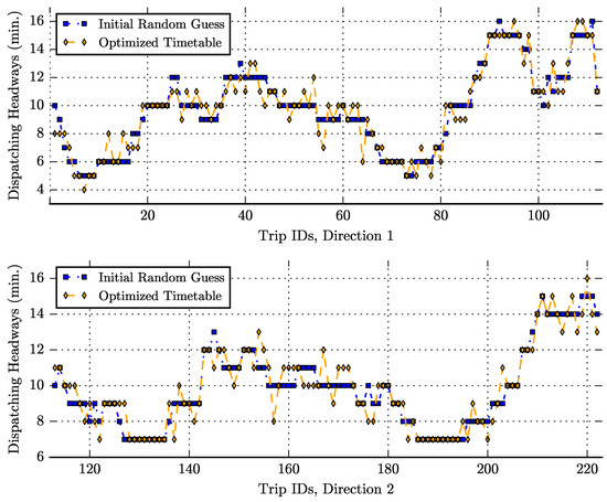 The GA optimization has been programmed in Python 2.7 and has been implemented in a computing machine with a 2.40 GHz processor and 16 GB RAM. After the implementation of the GA, the dispatching headways of consecutive bus trips of the initial random guess solution and the optimized timetable are summarized in Figure 4.