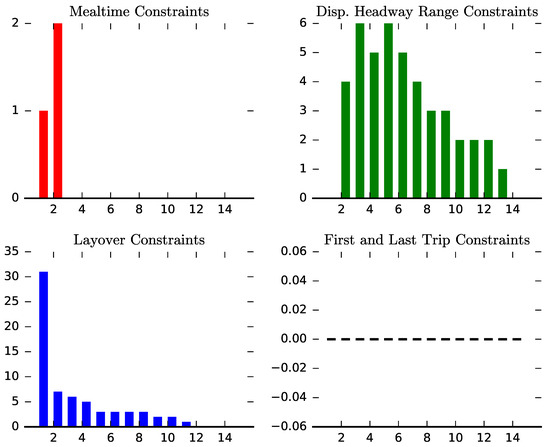 In the initial process of satisfying all the constraints that lasted up to the 14th generation, the interrelation of the regulatory constraints led to constraint asatisfaction trade-offs at each evolution step. Figure 5 presents these constraint satisfaction trade-offs at each generation of the GA. Initially, the vast majority of violated regulatory constraints was related to layover times (31 violations). At the 2nd generation, the dispatching time modifications of the daily trips reduced significantly the layover constraint violations from 31 to 6 but increased slightly the mealtime and dispatching headway range constraints. This trade-off among violated constraints continuous from generation to generation until all constraints are satisfied.