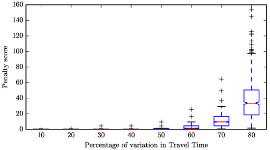 As a realistic service is prone to variation in travel times, it is necessary to study and observe the efficiency of the optimized timetable for different travel time variation scenarios. In order to study this effect, a set of simulation experiments are implemented. In each simulation, the travel times between control point stops are allowed to vary from their expected values by 10%, 20%, 30%, …, 80% and their values are sampled from a normal distribution with mean value equal to the expected travel time value and standard deviation equal to the variation percentage multiplied by the value of the expected travel time. For each one of the scenarios, 1000 simulations are implemented where the link travel times are sampled from the normal distribution and the results are presented in Figure 6 using the Tukey boxplot.