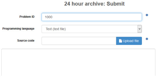 Figure 2. Typical interface to upload a problem solution in an online judge. - The judge automatically indicates whether the solution is correct or not. If not, classifies the failure mainly in Wrong Answer, Time limited exceeded or Runtime Error, allowing new solution attempts to the same problem.