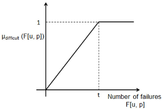 To provide flexibility to the modelling of the relationship between any user u and problem p, it is then considered the fuzzy set difficult that represents the difficulty level of a problem, which is represented through the membership function presented in Figure 5. As it is typically considered in this kind of fuzzy representation, it is very difficult the predefined initialization for the parameter t in the mentioned figure. This parameter is focused on characterizing the uncertainty level associated to each possible number of failures associated to some user in relation to a specific problem. Its optimal values will be analyzed as part of the experimental section.
