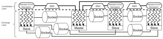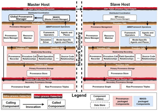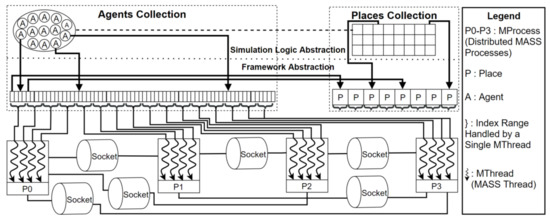 The MASS library organizes a distributed memory of agents and spatial data, through distributed computing, that are operated with symmetric multi-processing. Coordination of distributed computing resources proceeds in the master–slave paradigm, wherein distributed processes connect through secure shell (SSH) tunneling. Meanwhile, parallel coordination is extended to intra-process operations at each host through multithreading.