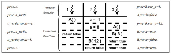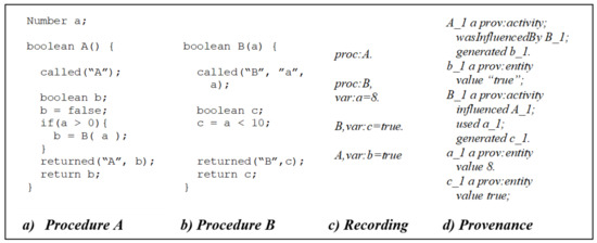 Consider the set of procedures shown in Figure 3, chained by sequential invocation. Procedure A calls Procedure B with Parameter a, receives a true Boolean value in return, and returns that value to the caller of Procedure A. The sequence of events is shown in the recording: Procedure A was invoked; then Procedure B was invoked, with Parameter a that had a value of 8; Procedure B generated Variable c that had a true Boolean value; and Procedure A generated Variable b that had a true Boolean value. Assume that implicit returns are recorded with an indication that nothing was returned to mark the end of an invocation (e.g., void). By splitting the recording on delimiters in an algorithm to model procedure call semantics, the sequential execution that led to this recording can be constructed, as shown in the provenance record at the far right of Figure 3. The provenance suggests that the invocation of Procedure B was part of the invocation of Procedure A (i.e., Procedure B influenced Procedure A). However, this assumption is only accurate due to sequential procedure invocation.