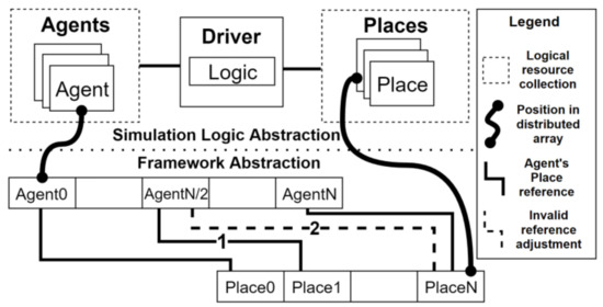 MASS stores simulation space and agents as shared resources in a distributed memory, managed at the object-level (shown in Figure 1). A host process, known as MProcess, maintains several thread objects, known as MThread, which operate shared resources (e.g., agents and spatial elements). A distributed array containing spatial elements, called Places, is stored in sections that span multiple processes in physically disparate hardware. Agents are mapped to Places and are contained in another global array.