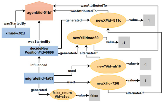 Traditional data provenance aims to answer questions such as find the process(es) that led to the current state of data X, find all the invocations of a procedure that ran at a given time, find the differences between two experiment or simulation outputs [8]. We take these traditional provenance queries and apply them to the context of agent-based systems. For example, the query “find the process(es) that led to the current state of data X” is applied to understand agent behavior (UC1, Section 3.2.1) and understand simulation execution (UC2, Section 3.2.2). The related queries are “What conditions (activities and entities) caused an agent to die” (UC1, Section 5.1.1) and “What activities and entities were involved in generating a given simulation output” (UC2, Section 5.1.2). Another example, i.e., the query “find all the invocations of a procedure that ran at a given time”, is applied to understand distributed execution (UC3, Section 3.2.3). The related query is “What operations across various hosts took place during a simulation” (UC3, Section 5.1.3). This last query can only be answered with ABM provenance support in a distributed setting, which ProvMASS provides.