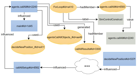 Knowledge of relationships between simulation logic and changes in agent state are provided by PT2. Two basic observations provide the foundation to capture provenance that connects agent behavior to a simulation workflow. First, simulation logic is embodied in source code, whereas changes in agent state are embodied in execution. Second, simulation logic instructs the MASS framework to perform operations over agents, which lead agents to exhibit behaviors. Therefore, three types of activities must be bridged to generate provenance type PT2: simulation driver instruction, framework resource coordination operations, and agent interactions.