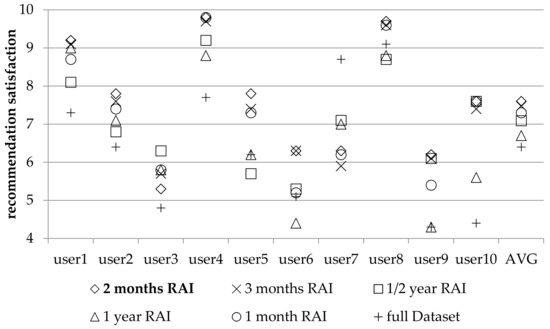 In Table 1 we can observe that the “2 month RAI” variant is established to have statistically significant superior performance with a confidence interval of 95% in comparison to the full dataset (i.e., the plain CF method) and the “1 year RAI” variant. On the contrary, statistical significance is not established for the variants “½ year RAI”, “3 month RAI” and “1 month RAI”, although the “2 month RAI” achieves a higher satisfaction average than these variants.