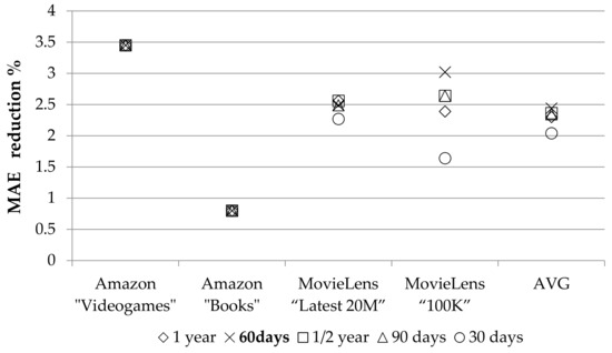 On average (last column on Figure 5), the RAI value of 60 days outperforms all other candidate RAI values, attaining a MAE reduction average of 2.44%. The ½ year abstention interval comes in second with an average MAE reduction of 2.36%, or 96.7% of the reduction achieved by the value of 60 days. The 90 days RAI was ranked 3rd, the 1 year RAI was ranked fourth, and the 30 days RAI was ranked fifth, with average MAE reductions of 2.34%, 2.30% and 2.04%, respectively. Furthermore, the 60 days RAI was ranked first (or tied at first position) among the five RAI values considered in Figure 5 at three out of the four datasets tested, and third in only one case (MovieLens “Latest 20 M—recommended for new research”), where the RAI values of 1 year and ½ year achieved a 0.07% higher reduction in the MAE. Besides the benefits in the MAE reduction, the RAI value of 60 days achieves a rating database size decrement by 6.2% on average, due to the elimination of ratings from the ratings database.