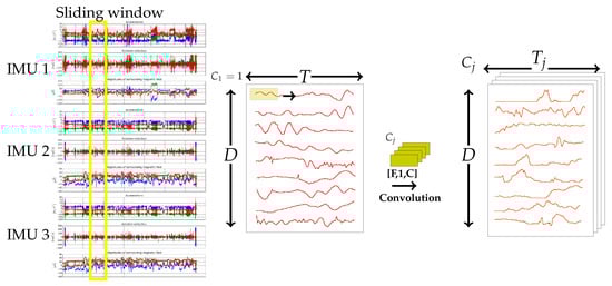 Example of IMUs’ measurements, a CNN’s input extracted following a sliding window approach, and a temporal convolution-operation in HAR.