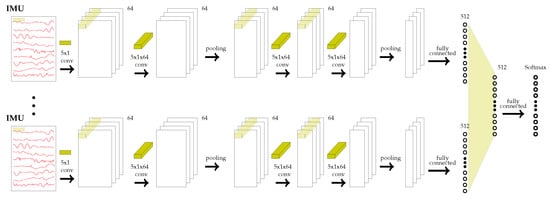 For comparison with the proposed CNN-IMU architecture, a CNN baseline is also evaluated following the architecture designs presented in [5,9]. This CNN has temporal convolutions over all sensor values. One can see it as a simpler CNN-IMU with a single branch for all of the IMUs’ sequences. Similarly, it contains temporal-convolutions and max-pooling operations followed by three fully-connected layers. The number of neurons per layer is and it is chosen according to [5], which is smaller than the one used in [11].