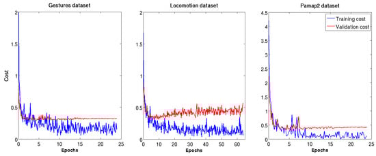 Training and Validation costs vs. epochs for the Opportunity-Gestures, -Locomotion and Pamap2 dataset using the CNN baseline.