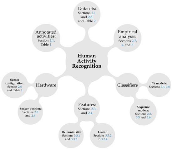 In this paper we address some of the open questions in the accelerometer-based AR, and particularly focus both on a comprehensive summary of the field and also an extensive experimental evaluation of possible configurations. Therefore, the rest of the paper is structured as follows: We summarise the recent research from the field and identify some open questions in Section 2. In Section 4 we address some of the open questions from Section 2 and present our main results with the classification models, feature representations and configurations that were described in Section 3. Finally, in Section 5 we conclude our main results. We summarise the structure of this paper in Figure 1 where the six important aspects of human activity recognition are shown: hardware, activity set, datasets features, classifiers and empirical performance evaluation. For each category (and subsequent child categories) we provide references to the sections and tables that introduce and discuss these topics.