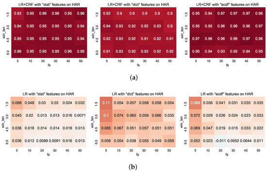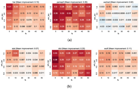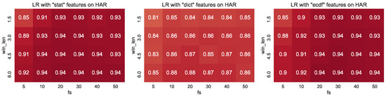 In [42], the authors investigate whether the high frequency information in the signal is relevant to the classification problem, and if not what level of down-sampling can be applied without affecting classification performance. In particular, the sampling frequency of 50 Hz was down-sampled to lower frequencies (without a low-pass filter) from 1 to 30 Hz. Accuracy was seen to increase with higher sampling rates, stabilising between 15–20 Hz, and only improved marginally above this. However, it should be noted that this was a biaxial rather than triaxial accelerometer, and that a fairly limited subset of features (no spectral features) were used, so it is difficult to draw a solid conclusion from this single study. More recent works also demonstrate that simple classification tasks can be effectively conducted at very low sampling frequency and resolution, increasing the battery lifetime of wearable sensors by more than an order of magnitude [49]. Khan et al. [50] performed a comprehensive study on optimising the sampling frequency of accelerometers in the context of human activity recognition. Their work concludes that the sampling rates that are used in the literature are up to higher than what is needed, leading to the waste of precious resources.