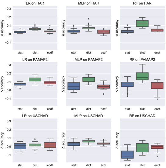 - Hammerla, N.; Kirkham, R.; Andras, P.; Ploetz, T. On Preserving Statistical Characteristics of Accelerometry Data Using Their Empirical Cumulative Distribution. In Proceedings of the 2013 International Symposium on Wearable Computers, Zurich, Switzerland, 8–12 September 2013; pp. 65–68. [Google Scholar]