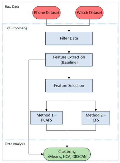 This study utilized data that had been obtained from accelerometer sensors found within smartphones and smartwatches [21]. This type of sensor is widely supported in existing mobile and wearable devices on the market and is extensively used in the area of activity recognition [2,16,29]. The remainder of this section expands on the steps that have been illustrated in Figure 1.
