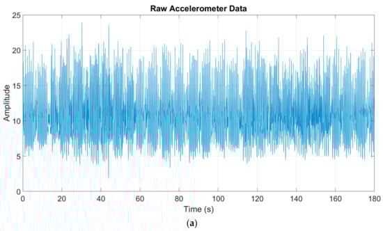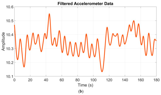 Combining the axis allowed for the overall vector magnitude to be obtained, which accounted for overall movement. This is a standard method of processing accelerometer data [21,30,31]. The raw data were then filtered using a second-order forward-backward digital low-pass Butterworth filter, with a cut-off frequency of 3 Hz (see Figure 2). As demonstrated in previous works [32,33,34], this cut-off frequency is appropriate to filter the data without losing any information.