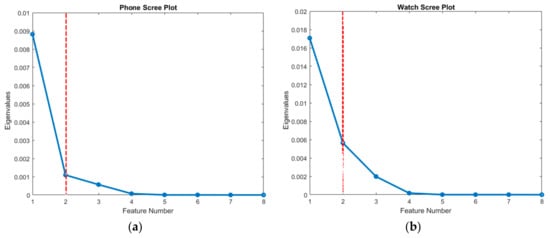 Once the features had been generated, dimensionality reduction was performed in order to find a subset of the most important features. This step was necessary to ascertain whether the results could be improved and to reduce the searching space, as some of the generated features might be unnecessary [49]. However, choosing the optimum number of features is usually challenging [50]. However, a scree plot can be used to overcome this issue. This graph plots the generated eigenvalues and arranges them in descending order. The point at which the curve of decreasing eigenvalues decelerates to a flat slope (also known as the “elbow”) is the cut-off point and determines the number of features to use [51,52]. Each dataset was analyzed separately. Figure 3a illustrates the generated scree plot of the Phone dataset, whilst Figure 3b illustrates the generated scree plot of the Watch dataset. As can be seen in Figure 3, the optimal number of features to use for both the Phone and Watch datasets was two. This indicates that out of the eight original features from Table 2, two had the best discriminative capabilities to represent the datasets.