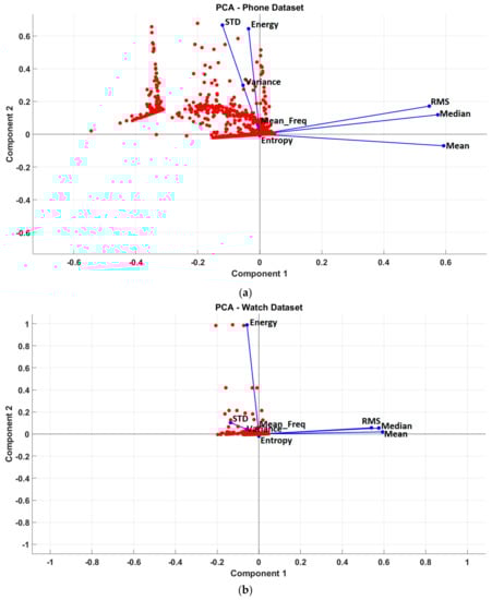 Figure 4a illustrates the PCA graph that was generated for the Phone dataset, whilst Figure 4b illustrates the PCA graph for the Watch dataset. Each feature in the bi-plot of Figure 4 is represented as an eigenvector and the direction and length of the vector (blue line) indicates how each variable contributes to the principal components in the plot. In selecting the best features, we needed to look for the features on the bi-plot that had large vectors and positive coefficients for both components.