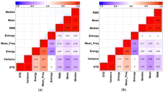 If x and y are linearly correlated, then r will be within the scale of 1 to −1. However, if the features are completely independent (i.e., uncorrelated) than r will be 0 [53,54]. In this case, features that are strongly correlated between each other may be removed. Therefore, if the correlation between sets of features is low, then they are regarded as suitable features to use [53]. Figure 5 illustrates heat maps that depict the relationship between the features of both datasets.