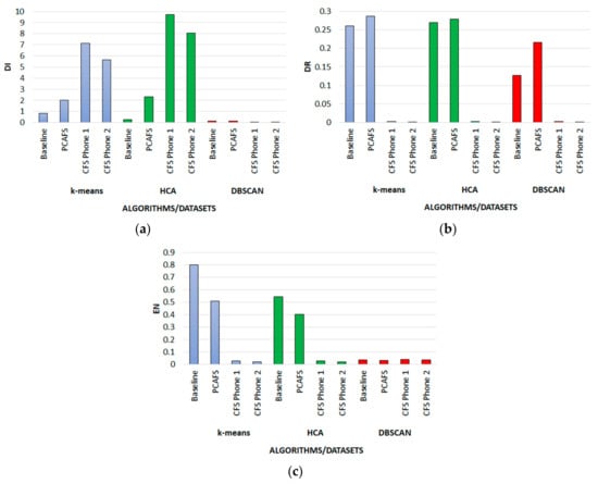 The results from Figure 6 illustrate that, using the baseline feature set, k-means produced the highest DI (0.8460), whilst HCA produced a slightly better DR (0.2705), and DBSCAN produced the lowest entropy (0.0377). However, when the feature set is reduced, these results improve upon the baseline. Looking to the PCAFS approach, k-means produced the highest DR (0.2866), whilst HCA performed better in terms of higher DI (2.3123), and DBSCAN again produced the lowest EN (0.0332). Using the CFS approach, HCA produced the best results using Phone1, which obtained a higher DI (9.7001) and DR (0.0028). Overall, the CFS feature selection approach and the HCA algorithm produced the best DI (9.7001) and EN (0.0187). This implies that these clusters are quite compact, well separated, and that uncertainty is reduced. DBSCAN appears to perform the worst.