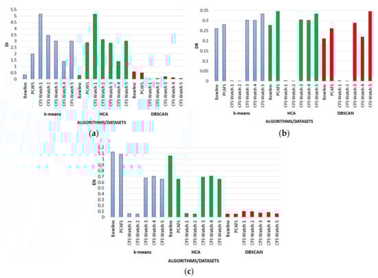 Clustering validation of the Watch datasets that illustrates (a) Dunn Index (DI), (b) distance ratio (DR), and (c) entropy (EN).