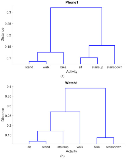 As observed by James et al. [67], when interpreting dendrograms, “observations that fuse at the very bottom of the tree are quite similar to each other, whereas observations that fuse close to the top of the tree will tend to be quite different”. Therefore, as can be seen in Figure 8a, when using a smartphone for activity recognition, standing and walking are the most similar to each other, whilst walking down the stairs and biking are quite distinct to other activities. Figure 8b illustrates that when using a smartwatch for activity recognition, sitting and standing are the most similar, whilst walking and going up the stairs are quite distinct from other activities. It can be inferred that this could be due to the placement of the sensors. For example, a smartwatch around the wrist will pick up hand movements as people move their hands as they walk and go up the stairs. This signature is quite unique to each individual. A smartphone, on the other hand, may be placed in the subject’s pockets and would not be subjected to this type of movement.