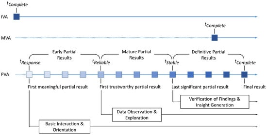 The description of PVA put forth in this section follows the output-driven perspective mentioned in the introduction by using discrete time points to partition the progression into stages of different analytical utility. This characterization mirrors recent research in activity-centered visualization design that assesses a visualization based on the tasks and activities it supports [20], instead of just looking at how faithful it represents the data (cp. representational primacy [21]). Yet, the resulting staged model of PVA neither invalidates, nor supersedes the understanding of PVA as a continuous stream of results that improves over time, as formulated for example by Fekete and Primet [2] and as signified by the blue squares in Figure 1—but rather complements it. This is in particular so, as the stages assumed by the model are hardly fixed, easy to determine, or even well-defined, because they are highly dependent on the data, the task, the user, and the domain. But for the remainder of the paper, the four time points and the intervals in between them provide us with an abstraction of a PVA run that serves as a relatable and meaningful frame of reference to which we can map the highly heterogeneous body of literature on one hand, and to which the readers can map their own PVA scenario or use case on the other hand.