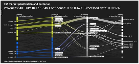 - Angelini, M.; Corriero, R.; Franceschi, F.; Geymonat, M.; Mirabelli, M.; Remondino, C.; Santucci, G.; Stabellini, B. A Visual Analytics System for Mobile Telecommunication Marketing Analysis. In Proceedings of the International EuroVis Workshop on Visual Analytics (EuroVA), Groningen, The Netherlands, 6–7 June 2016; Andrienko, N., Sedlmair, M., Eds.; Eurographics Association: Aire-la-Ville, Switzerland, 2016. [Google Scholar] [CrossRef]