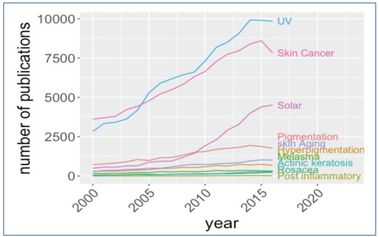 The six skin conditions have been selected based on prevalence in the literature review and UCSF patient data, and finally double checked with expert consulting from different medical schools around the USA such as Ohio, Pennsylvania, Texas, Berkley, and UCSF. Our cohort was composed of female patients. They are more female’s history in skin conditions compare with men in electronic medical records, which constituted 54 percent of all patients. Figure 1 shows the diversity of skin conditions from 527,273 female patients in the UCSF patient data for these skin conditions. We also looked at the publications from 2000 to 2017. As it shows in Figure 2 during the last almost 20 years, there have been several studies in the conditions such as UV, solar and cancer (excluded in our study), but the other conditions are neglected in comparison with these three conditions. Still, so many individual studies have been published. Therefore, we decided to focus on skin conditions including hyperpigmentation, Melasma, Rosacea, Postinflammatory hyperpigmentation, Actinic Aeratosis, and Pigmentation.