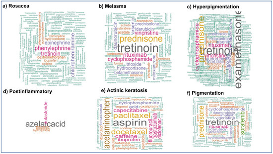 We discuss other the common factors between different conditions. For example Azelaic Acid is a drug used to treat Rosacea and acne (even though it is not in our top drugs list), kills acne bacteria, and reduces production of keratin, reduces inflammation, reduces synthesis of melanin and is used for the treatment of skin pigmentation. Thioredoxin reductase and TYR genes are affected by Azelaic Acid and these two genes are presented as extracted genes in all these conditions. The overlap of these genes across conditions suggests the hypothesis of using this drug for treatment of all conditions and not just for Rosacea and/or Post inflammatory. AKR1D1 (aldo-keto reductase family 1 member D1) and SRD5A2 (steroid 5 alpha-reductase 2) as an enzyme also present in all these conditions, and are located in the cytoplasm, which is responded to the same drug.