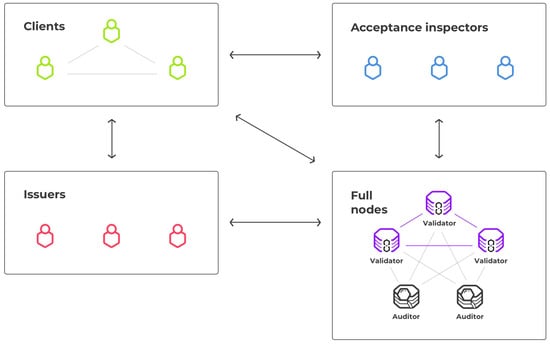 - (Transactions) validators: the computing centres of Russian Post that perform the functions of blockchain validators []. The initial list of their public keys is written in the blockchain’s genesis block and can subsequently be changed by the consensus of the validators. A high-performance computer with high-speed and reliable Internet access, as well as a private key from the list of validators, are required for their work. Validators check compliance of transactions entering the network with formal blockchain rules; compose blocks from the correct transactions, and participate in the consensus on adding new blocks to the blockchain