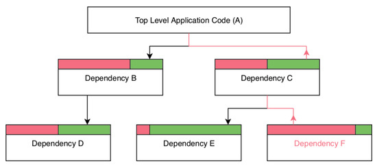 Figure 1 illustrates the transitive dependency tree of an application, and demonstrates how outdated modules can be imported into top-level applications. Transitive dependencies can introduce vulnerabilities through version pinning. In the diagram, arrows represent transitive dependency calls, while the red and green sections represent vulnerable and patched module versions respectively. Many of the applications tested contained known vulnerable elements (Table 1) however, a number of well known applications passed this scan with no vulnerabilities detected. With this in mind, it was necessary to widen the scope to audit other aspects of the application processes, one of which was the update process.