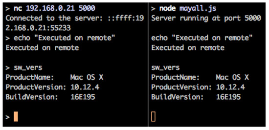 Before the injection of an application is demonstrated, it is necessary to generate a payload that is able to communicate with and receive commands from a remote Command and Control (C2) server as demonstrated in Listing 1 representing the target code, and Listing 2 representing the pseudo code for the C2 Server. As Node.js is the underlying language that Electron is based on, the basic module was built in Node.js without Electron in mind—Electron is primarily used as the visual bolt-on to a Node.js application, exposing the Graphical User Interface (GUI) and other interaction methods to an end-user and Node modules can still be run underneath Electron.